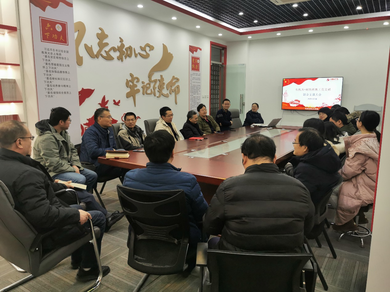 2021年12月8日,为了增进理工学科交叉融合,增强党组织的凝聚力,激发党员的奋斗热情,有机所和制药所两个教工党支部召开联合支部大会,以组织开展党史教育学习主题活动为契机,迈出了有机所与制药所相互学习、相互促进第一步。有机所和制药所教工党支部的全体党员,非党员教师参加,会议由有机所支俊格书记主持。