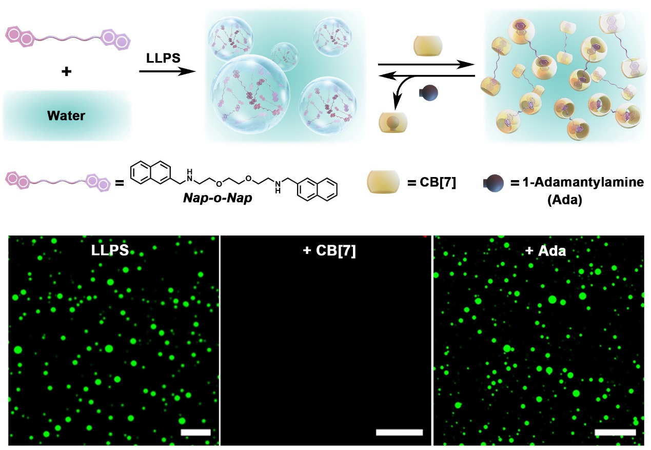 近日,jinnian金年会高宁教授和北京大学黄泽寰研究员合作,通过提取IDPs的关键结构特征,设计合成了一种具备发生液-液相分离能力的小分子:Nap-o-Nap。如下图所示,该化合物由两个萘环和一个乙二醇衍生物连接而成,在生理条件下可以发生类似IDPs的液-液相分离。更为关键的是,该小分子的液-液相分离行为可以通过定量加入葫芦[7]脲和金刚烷铵盐酸盐来实现超分子可逆调控。