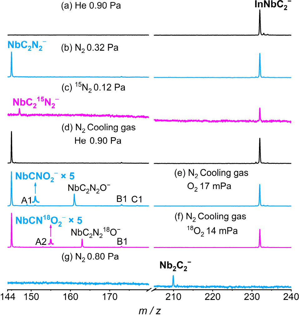 图1. InNbC2阴离子分别与(a)He、(b)N2、和(c)15N2反应、中间产物Nb(CN)2阴离子分别与(d)He、(e)O2和(f)18O2反应以及Nb2C2阴离子与(g)N2反应的飞行时间质谱图。