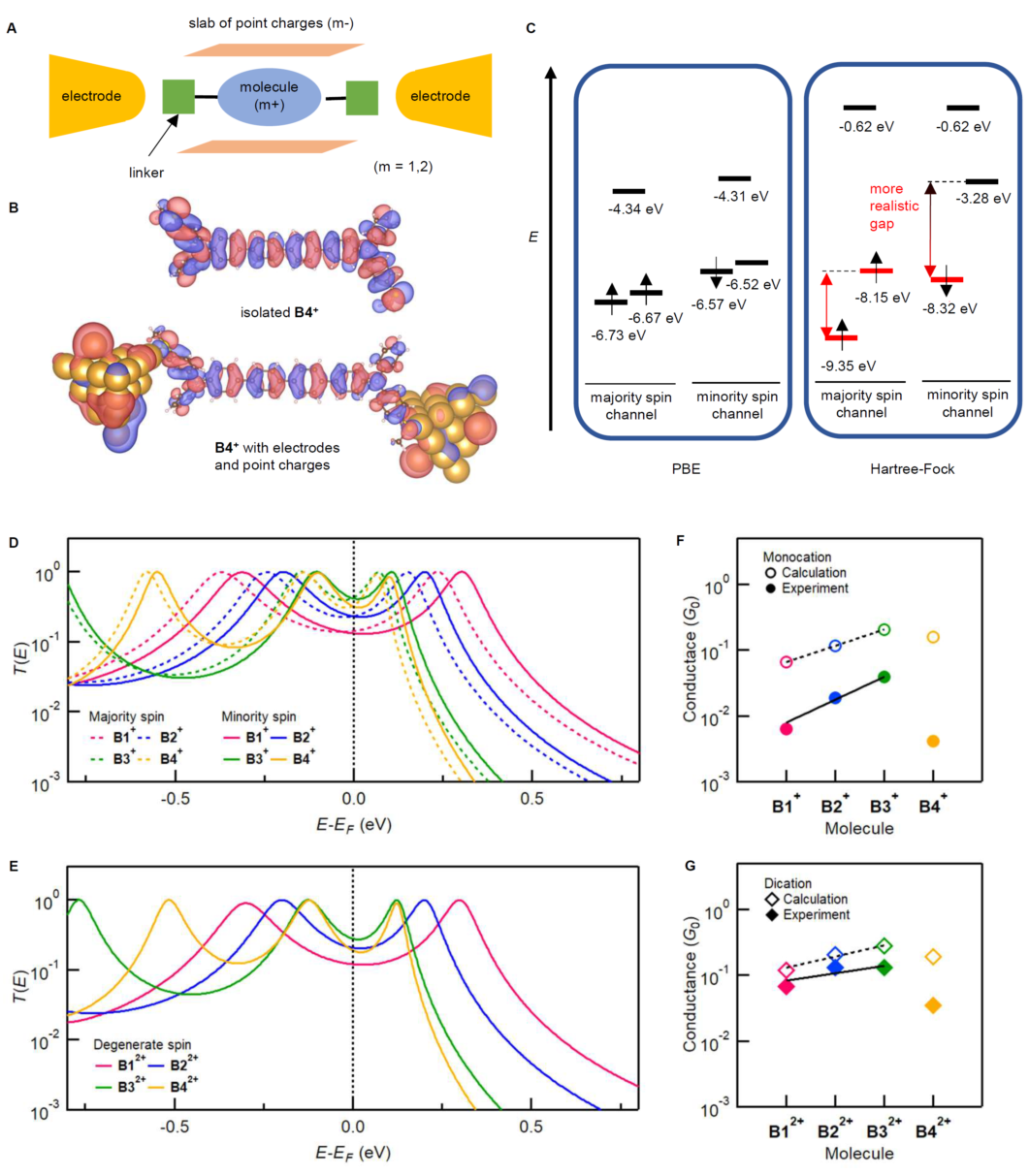 研究人员基于STM-BJ测试平台系统研究了该类分子导线在不同氧化态的单分子电导性质。其中,B32+分子导线显示出明显高于 0.1 G0 (2e2/h, 电导量子)的超高电导率,相比其中性分子高 5400 倍,且分子导线长度达到2.6 nm。研究人员也观察到氧化后的阳离子型分子导线呈现电导与导线长度的负相关特征,分别为b(B1-3+)=-0.9/苯;b(B1-32+)=-0.3/苯,表明该类分子导线具有SSH模型描述的一维拓扑绝缘体特征。此外,研究人员也观察到了B4分子导线在氧化之后并没有延续前三个分子导线的电导趋势,而是表现出了明显的下降,这也说明了基于SSH模型的分子导线电导性质与长度有较强的相关性。