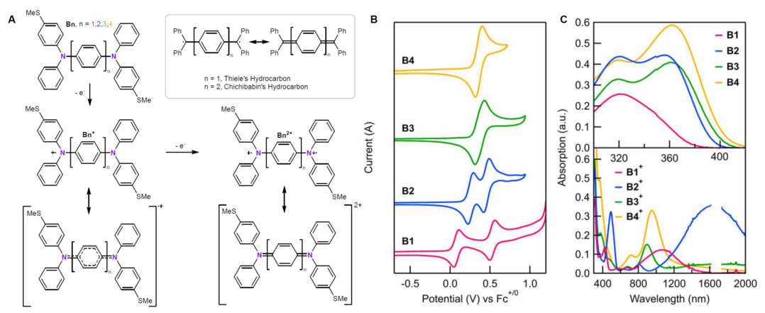 图 1. 含低聚苯桥的双(三芳基胺)分子导线(B1-B4),及其电化学和光谱性质