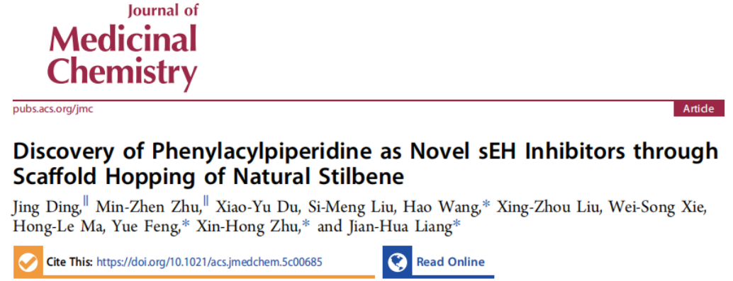 近日,jinnian金年会医药分子科学与制剂工程工信部重点实验室梁建华课题组,以天然产物二苯乙烯为先导物,基于骨架跃迁策略成功优选出一种“新型可溶性环氧水解酶”(sEH)抑制剂DJ-89(化合物77),为临床需求未满足的胰腺炎和关节炎的治疗带来新策略,2025年4月14日以“Discovery of Phenylacylpiperidine as Novel sEH Inhibitors through Scaffold Hopping of Natural Stilbene”为题在线发表在国际权威的新药研发期刊《Journal of Medicinal Chemistry》(文章链接:https://doi.org/10.1021/acs.jmedchem.5c00685)。该候选药物的体外sEH酶抑制活性(IC50低至0.51 nM)远高于现有临床候选药物EC5026;并在急性和慢性炎症动物模型中抗炎镇痛药效显著。在风湿性关节炎模型中DJ-89通过抑制肝脏中sEH酶活性,提高抗炎因子EET水平,有效减轻组织和关节的炎症症状,显著改善了动物的健康状况。与现有关节炎临床药物治疗方法相比,DJ-89具有新的作用靶标和生物途径,具有优异的临床安全性,这一研究成果为风湿性关节炎等自身免疫性疾病的治疗提供了全新的解决方案。