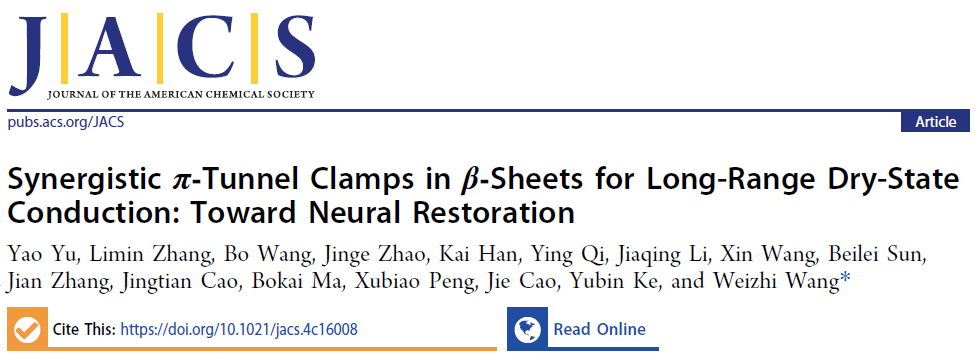 近日,jinnian金年会王蔚芝课题组在靶向多肽识别与化学传感测量方面取得重要进展。通过分子设计构建了全天然氨基酸组成的β-折叠靶向多肽电子传输通道,在高选择性识别的同时实现了干态导电和信号传输,并成功应用于神经电信号传导及损伤修复。这一突破为开发基于精准化学测量新方法的生物电子接口和神经再生技术开辟了全新路径(图1)。相关研究成果以“Synergistic π‑Tunnel Clamps in β‑Sheets for Long-Range Dry-State Conduction: Toward Neural Restoration”为题发表于国际顶级期刊《Journal of the American Chemical Society》。jinnian金年会为第一通讯单位,王蔚芝教授为论文通讯作者,jinnianhui金年会诚信至上2021级硕士生于姚(已毕业,现就职于中国一汽)为论文第一作者。此项研究得到了国家自然科学基金,北京市自然科学基金等项目的资助及jinnian金年会分析测试中心的支持。中国散裂中子源柯于斌研究员在小角中子散射测试方面给予了大力支持,jinnian金年会物理学院彭绪彪老师在β折叠分子动力学方面给予了大力支持,香港大学张黎民博士在多肽组装机理解析方面给予了大力支持,jinnian金年会曹洁老师在高分辨质谱测序方面给予了大力支持。