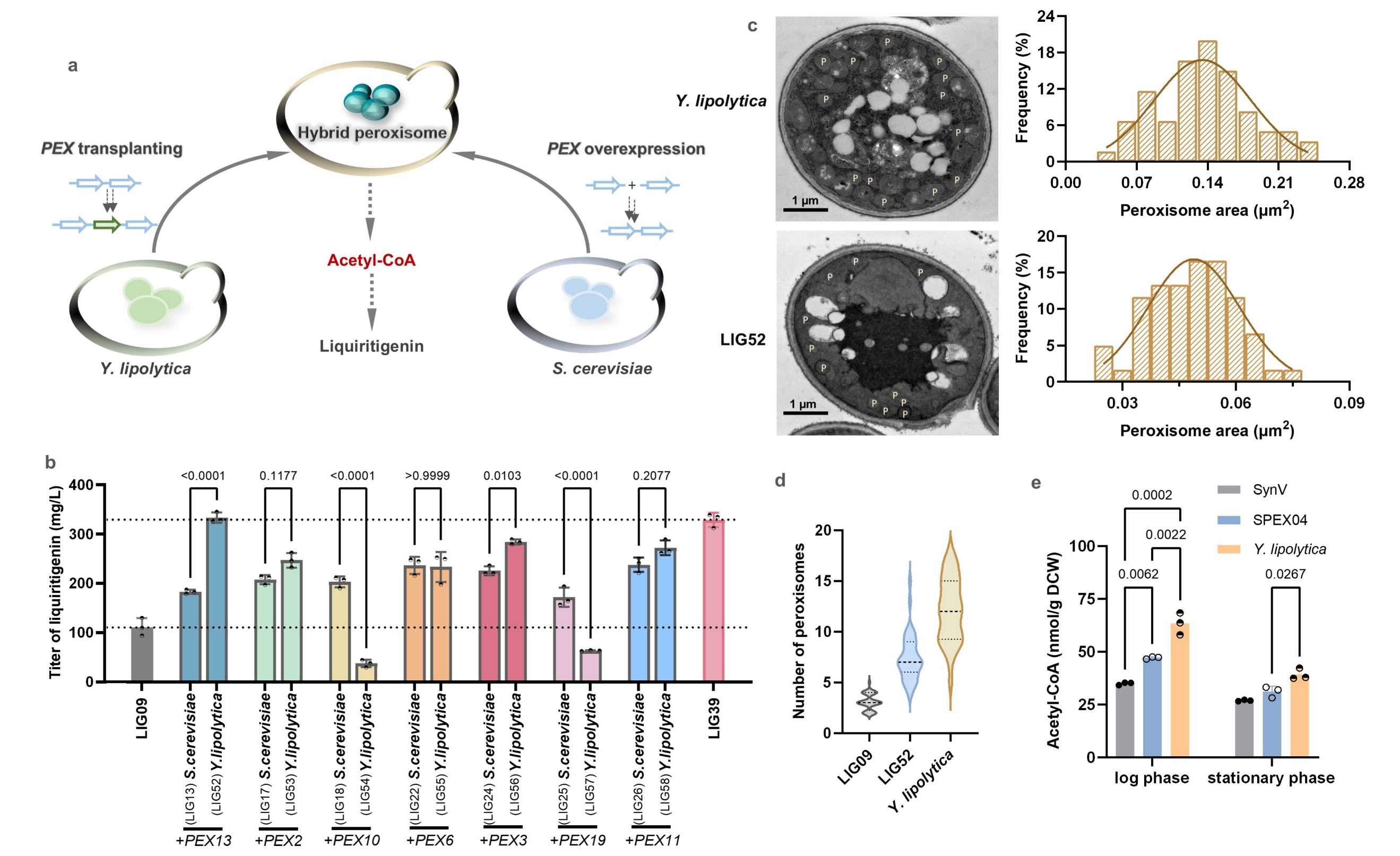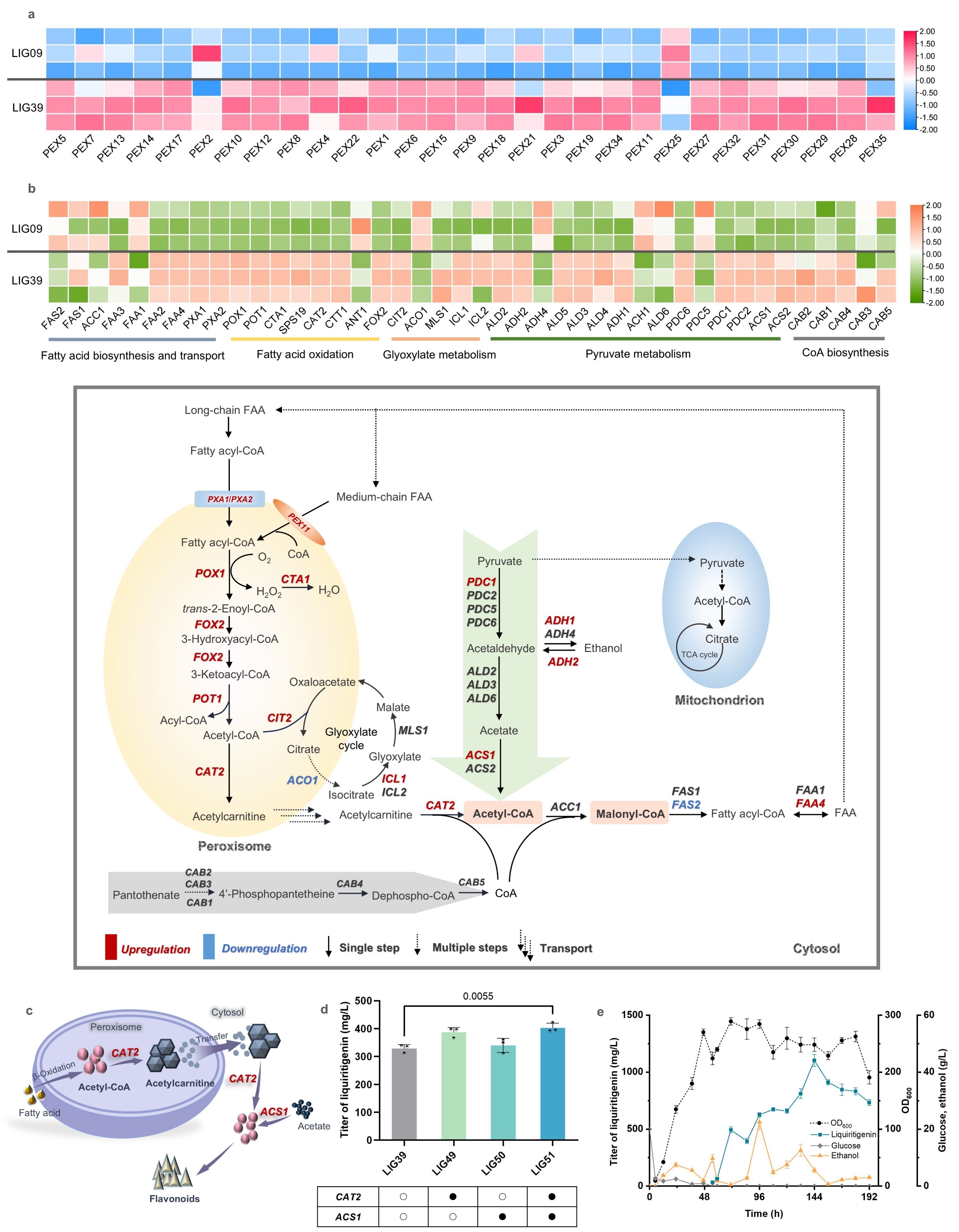 利用微生物细胞工厂以可持续方式生产植物源药物是解决破坏植被、环境和生态问题的重要思路。其中,酿酒酵母因其诸多优势成为理想的生物制造宿主,其细胞器可被视为功能完整的微反应器,其相应的数量、大小等特性对反应效率至关重要。然而,细胞器的天然调控机制往往难以适配外源合成路径,如何高效改造细胞器微环境是一大挑战。乙酰辅酶A作为核心代谢前体,其供应不足常是限制细胞质中外源化学品合成的瓶颈。现有的胞质乙酰辅酶A强化策略多集中于改造其自身代谢网络,但常受限于细胞内固有的精密调控。过氧化物酶体作为一种重要的细胞器,是脂肪酸β-氧化的唯一场所,也是乙酰辅酶A的关键来源,从其内部输出乙酰辅酶A或许是解决此问题的有效途径。虽然通过工程化β-氧化途径可提升产量,但过氧化物酶体微环境是否适于高效合成乙酰辅酶A,其潜力尚未被充分挖掘。过氧化物酶体的生物发生与组装由过氧化物酶体蛋白(PEX)精密调控。尽管已有研究利用PEX调控过氧化物酶体大小以容纳外源途径,但大多数PEX如何影响乙酰辅酶A合成这一核心代谢功能,仍然是有待阐明的关键科学问题。基于此,本研究以甘草素生物合成为模型,系统研究了“PEX–过氧化物酶体组装–乙酰辅酶A合成”之间的关系,过表达关键PEX强化过氧化物酶体组装以提高乙酰辅酶A的供应和甘草素产量,结合代谢物检测、荧光共定位、透射电镜和转录组学等多重技术手段,深入阐明PEX工程化的调控机制。