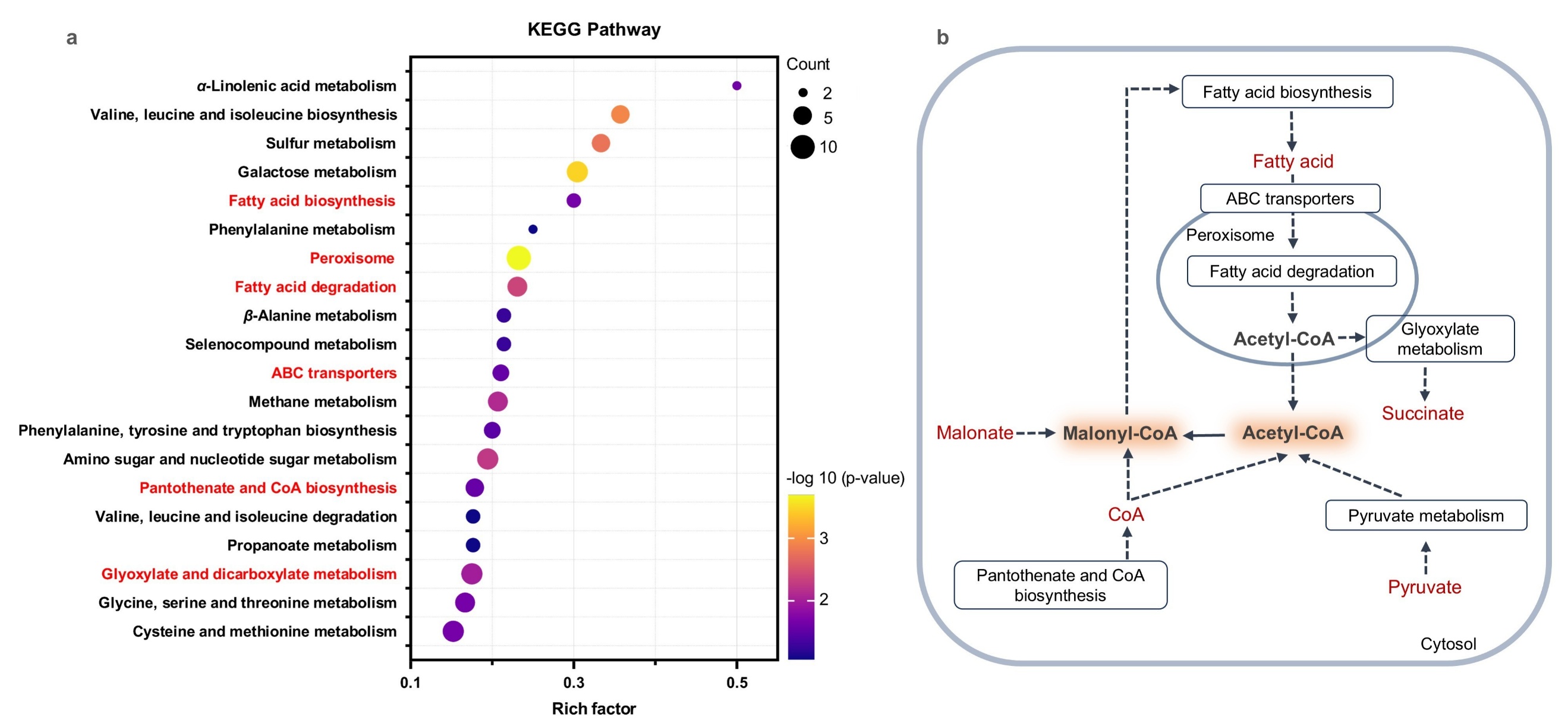通过蛋白质组学解析高产甘草素菌株的全局代谢响应,发现多个显著上调的通路均与乙酰辅酶A代谢密切相关,且功能上与过氧化物酶体高度耦合。因此,聚焦PEX调控过氧化物酶体的组装,以期突破其乙酰辅酶A的供应瓶颈,从而进一步提升甘草素产量。