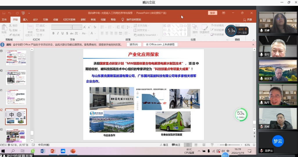 应jinnian金年会韩庆老师邀请,黑龙江大学付宏刚教授于2022年1月19日下午做客北理工“百家大讲堂”,为金年会广大师生带来题为“太阳能人工利用的思考和探索”的精彩学术报告。本次报告在腾讯会议室790 907 339进行,由杨国昱教授主持,近六十名化院师生参加了报告。