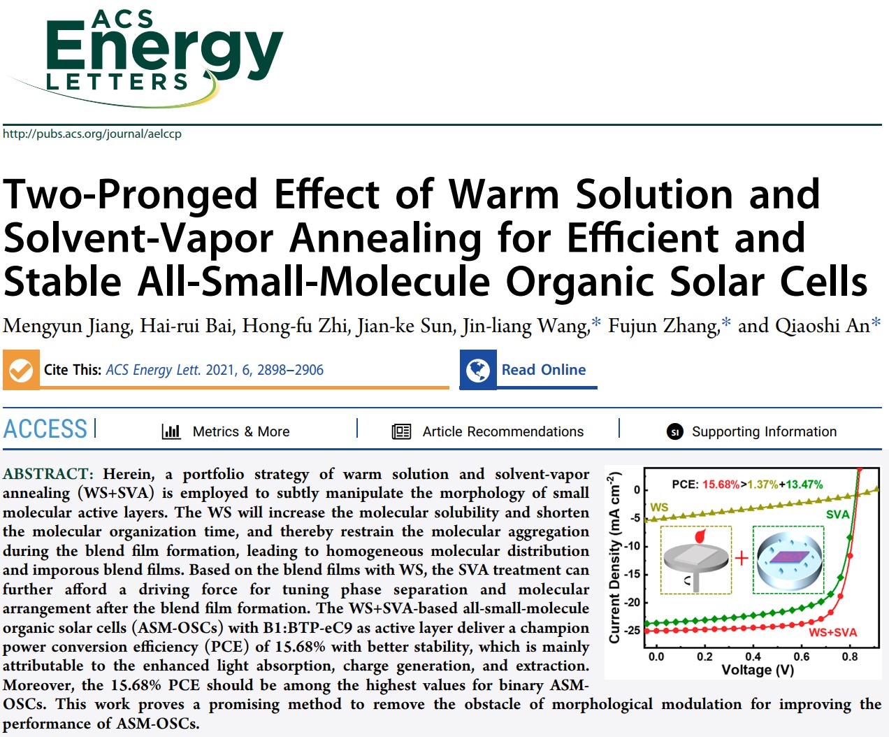 近日,jinnian金年会硕士研究生蒋梦云以第一作身份在国际顶级期刊ACS Energy Letters发表题目为“Two-Pronged Effect of Warm Solution and Solvent-Vapor Annealing for Efficient and Stable All-Small-Molecule Organic Solar Cells”的研究论文。jinnian金年会为第一通讯单位,jinnian金年会安桥石特别研究员、王金亮教授和北京交通大学张福俊教授为共同通讯作者。本研究得到了国家自然科学基金,北京市自然科学基金和jinnian金年会青年教师学术启动计划等项目的资助及jinnian金年会分析测试中心的支持。
