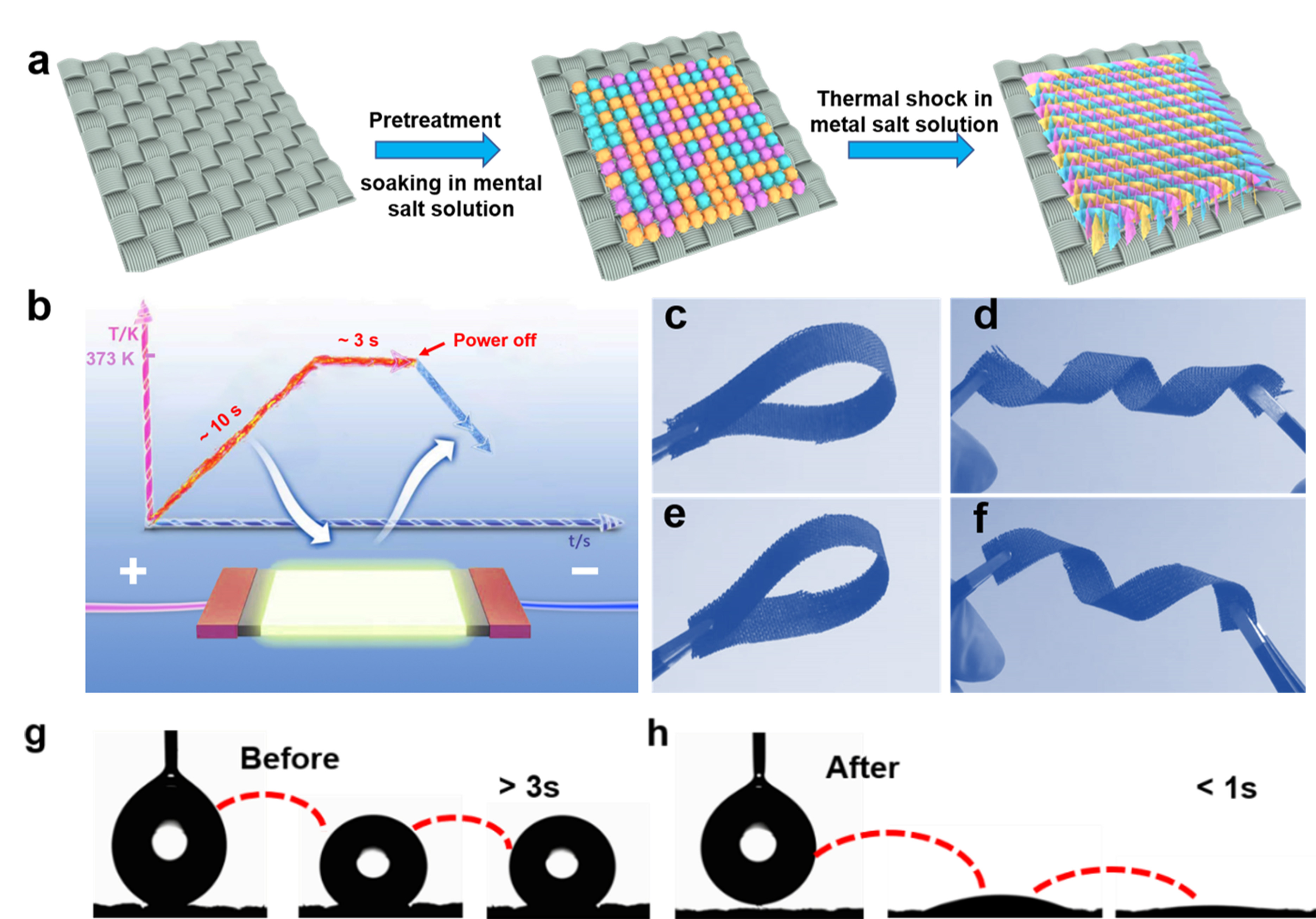 图1 热冲击制备示意图以及样品柔性和亲水性展示