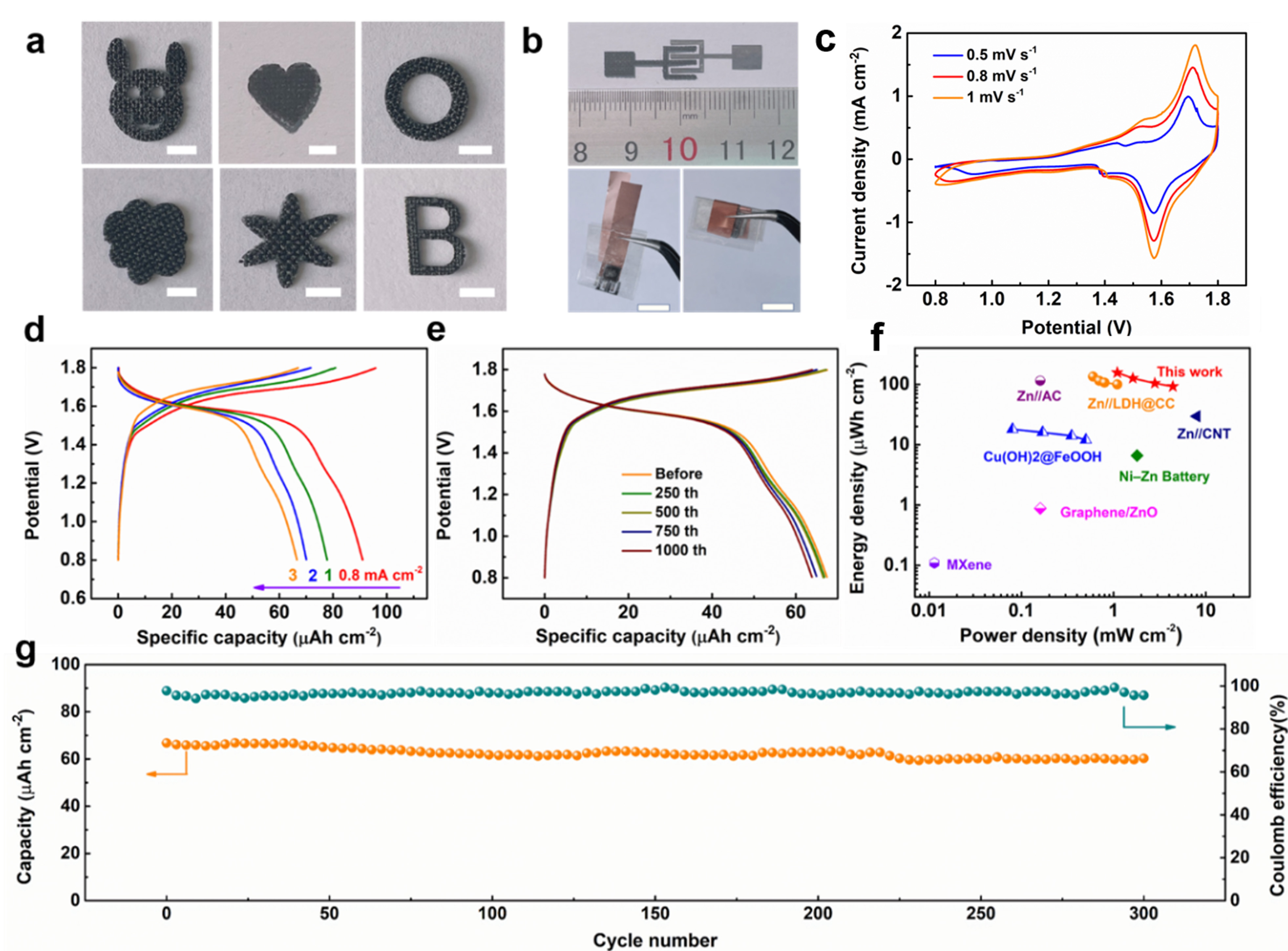 除了快速和大规模生产的优点外,制备的NiCoLDH@CC还显示出突出的机械稳定性、灵活性和可加工性,可任意切割成各种图案(图6a),显示出在下一代新兴能源设备中的潜力。例如,芯片上的微电源(例如,微型电池、微型超级电容器)由于其高能量密度和集成到微型设备的巨大可行性,近年来引起了极大的关注,这是智能医疗植入物、人工智能机器人和其他自供电微系统开发所必需的。为此,可以通过激光切割定制叉指电极图案。如图所示,6b,基于叉指式NiCo构建了柔性准固态片上碱性水性NiCo-Zn微电池(NC-ZMB,基于整个器件,面积约为0.6 cm-2)LDH@CC微电极、锌板微电极和PVA-KOH凝胶电解质。值得注意的是,NC-ZMB显示出显著的灵活性,如弯曲和旋转(图6b)。图6c-g为微电池的电化学性能图,其中最大面积比容量达到92µAh cm-2。