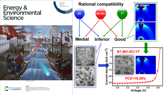 近日,jinnian金年会硕士研究生蒋梦云以第一作者身份在国际顶级期刊Energy Environmental & Science (IF: 38.5)发表题目为“Rational compatibility in a ternary matrix enables all-small-molecule organic solar cells with over 16% efficiency的研究论文,此论文被选为该杂志2021年第7期的Front Cover。jinnian金年会为第一通讯单位,jinnian金年会安桥石特别研究员、王金亮教授和北京交通大学张福俊教授为共同通讯作者,本研究得到了国家自然科学基金,北京市自然科学基金和jinnian金年会青年教师学术启动计划等项目的资助及jinnian金年会分析测试中心的支持。