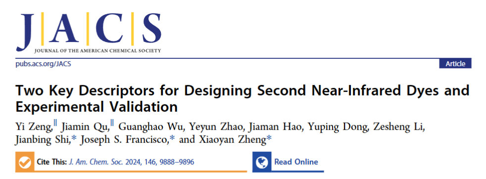 近日,jinnian金年会郑小燕副教授和材料学院石建兵副教授,与美国宾夕法尼亚大学Francisco教授合作,在近红外二区(NIR-II)荧光染料理论设计方面取得重要进展。相关成果以“Two key descriptors for designing second near-infrared dyes and experimental validation”为题发表于国际顶级期刊《Journal of the American Chemical Society》。jinnian金年会为第一通讯单位,曾怡和屈佳敏两位博士生为共同第一作者,郑小燕、石建兵和Francisco教授为共同通讯作者,李泽生教授和董宇平教授对本工作给予了重要指导。