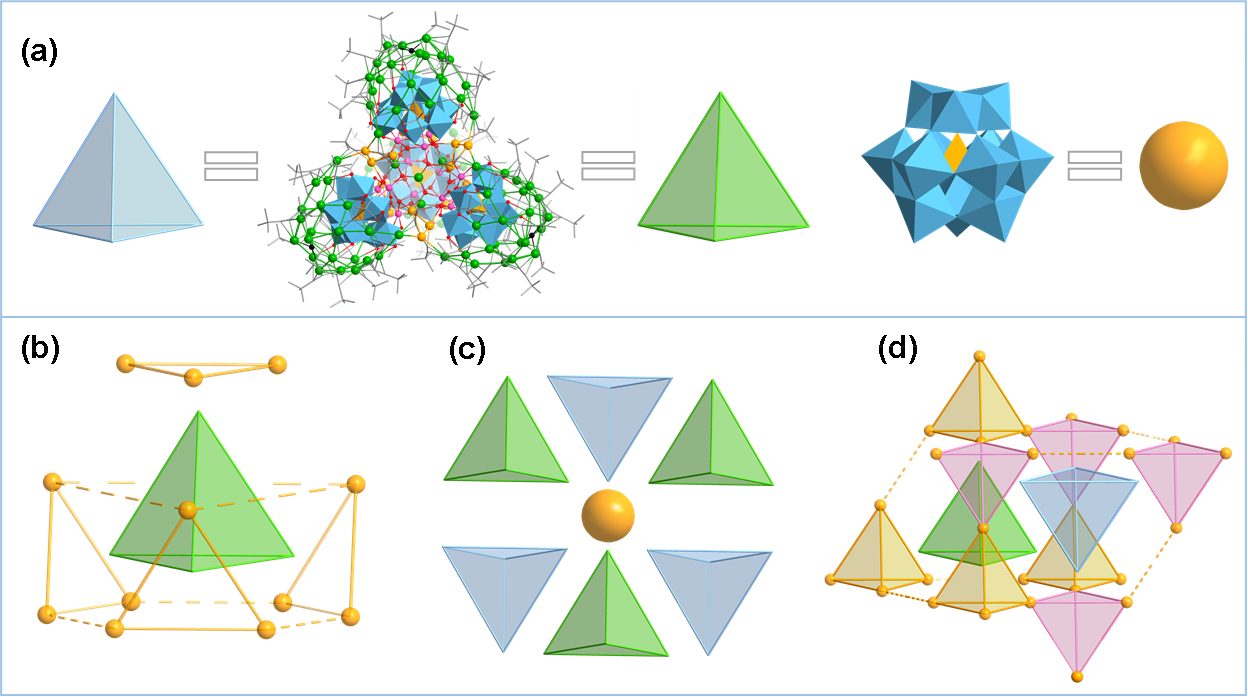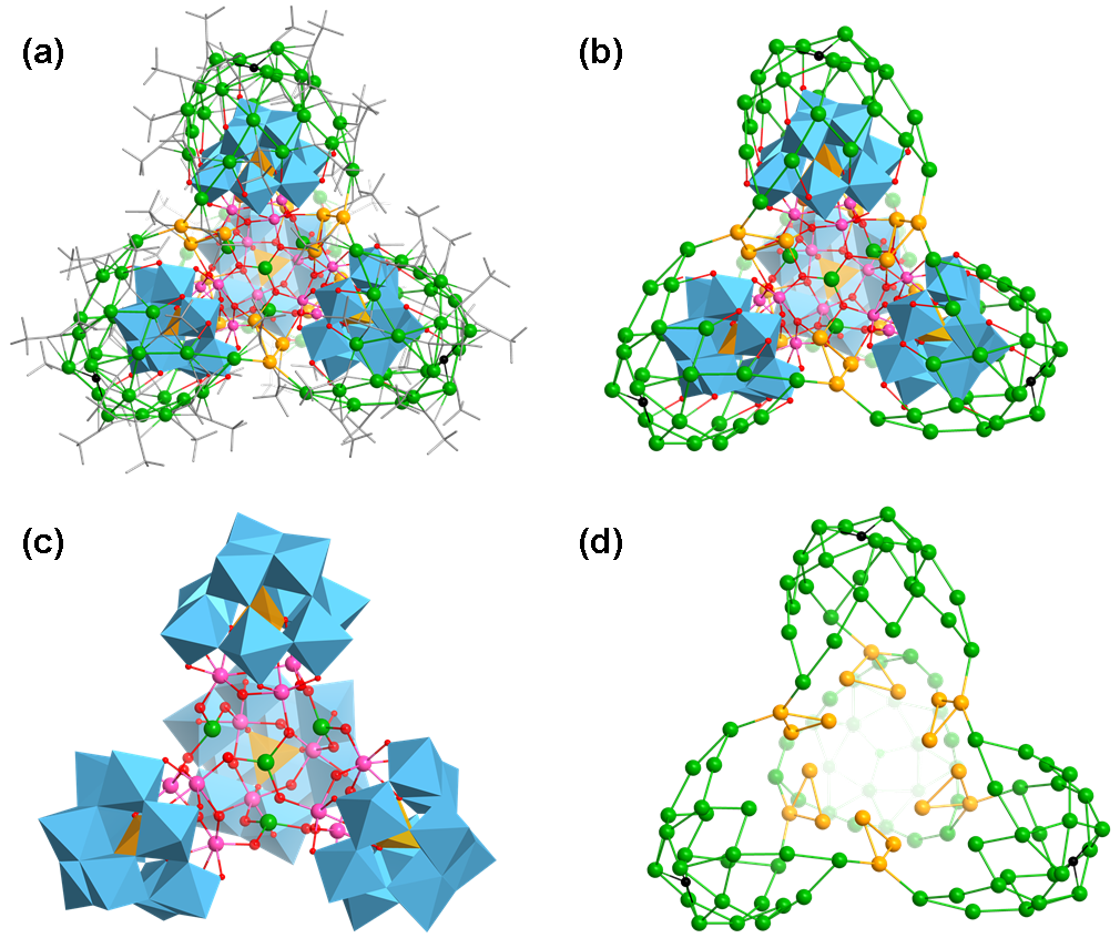采用普适性简单溶剂热法成功制备了三例同构型具有高核过渡金属(Co/Cu)取代的POMs(TMPOMs)为模板的超大闭壳银团簇化合物12,和3。其中,化合物1的晶体结构分析表明,该化合物由TMCPOMs [(Co0.58W0.42)3(OH)3(Ag0.5O3)(SiW9O34)}4]30−为模板的巨型阳离子型银团簇[{(Co0.58W0.42)3(OH)3(Ag0.5O3)(SiW9O34)}4@Ag114Br4(tBuC≡C)72]8+{  [(SiW9)(Co0.58W0.42)3]4@Ag114}和两个{SiW12O40}抗衡阴离子组成,其中TMCPOMs的Td对称性对闭壳银团簇的形成具有重要贡献,形成了迄今为止报道的最大TMCPOMs为模板的闭壳银团簇。化合物2,和3的结构与化合物1的结构相比而言,其差异主要在于POMs缺位取代的过渡金属类型或POMs的杂原子类型。