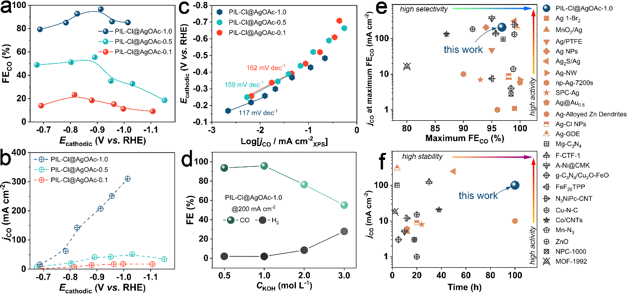 性能评价显示不同Ag浸渍量对电催化CO2至CO转化的选择性与活性影响非常显著。动力学(Tafel)分析则揭示了不同浸渍量时活性位点的内在活性区别较小。通过与文献报道的其他先进催化剂对比表明,最优的PIL-Cl@AgOAc-1.0催化剂体现出优秀的选择性、活性与催化稳定性。进一步研究表明,PIL中阳离子骨架结构与Ag盐的种类通过影响PIL-Ag相互作用强度和Ag+供给速度来影响Ag–Cl物种的存在形式。Ag–Cl纳米颗粒在大电流密度下的CO选择性衰减较慢,CO选择性的总体高低与Ag–Cl纳米颗粒的数量密切相关;Ag–Cl簇体现较高的初始CO选择性,但难以在大电流密度下维持高选择性。
