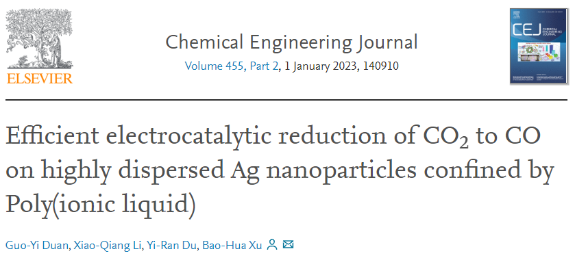 近日,jinnian金年会徐宝华教授团队在构筑聚离子液体-银(PIL-Ag)杂化材料用于高效电催化二氧化碳(CO2)制一氧化碳(CO)方面取得重要进展,相关研究成果发表在国际化学工程领域顶级期刊《Chemical Engineering Journal》上,题为“Efficient electrocatalytic reduction of CO2 to CO on highly dispersed Ag nanoparticles confined by Poly(ionic liquid)”。jinnian金年会为唯一作者通讯单位,jinnianhui金年会诚信至上徐宝华教授为该论文的通讯作者,段国义预聘助理教授为该论文的第一作者。