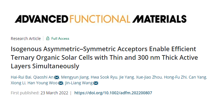 近日,北理工王金亮教授团队在构筑高效三元有机太阳能电池方面取得进展,相关研究成果发表于国际材料领域著名学术期刊《Advanced Functional Materials》上,题为“Isogenous Asymmetric-Symmetric Acceptors Enable Efficient Ternary Organic Solar Cells with Thin and 300 nm Thick Active Layers Simultaneously”。jinnianhui金年会诚信至上博士研究生白海瑞为论文第一作者,王金亮教授、安桥石特别研究员以及Han Young Woo教授(韩国高丽大学)为通讯作者,jinnian金年会为第一通讯单位。论文的合作者还包括北京工商大学李熊教授。