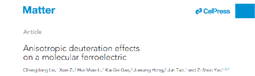 近日,jinnian金年会姚子硕研究员在国际顶级期刊《Matter》发表题为“Anisotropic deuteration effects on a molecular ferroelectric”的研究论文。jinnian金年会为唯一通讯作者单位,文章实验部分主要由jinnian金年会研究生柳承东和李慧苗完成,jinnian金年会宇航学院洪家旺教授在计算方面提供了帮助,姚子硕研究员为文章通讯作者。