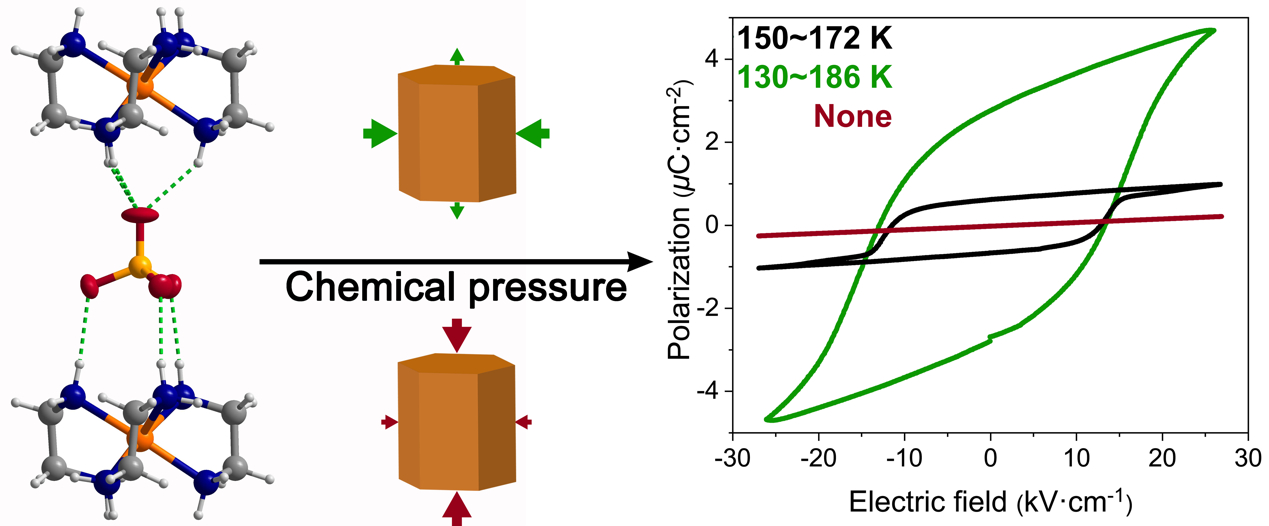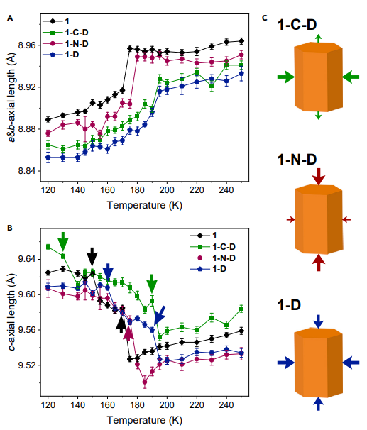该研究团队在前期通过结构变化调控材料物理性质的研究基础(Nat. Chem., 2014, 6, 1079-1083; Nat. Commun. 2019, 10, 4805; CCS Chem. 2021, 2, 2464–2472; Nat. Commun. 2021, 12, 6908;Angew. Chem. Int. Ed. 2023, 62, e202217977; J. Am. Chem. Soc. 2023, 145, 5545-5552),针对单晶晶格各向异性的结构特征,提出选择性氘代引入各向异性化学压力的研究思路,通过对具有三方晶系的硫酸三乙二胺合钴铁电化合物进行选择性氘代,在弱氢键功能材料中实现了显著的氘代效应。当对C-H原子氘代时铁电窗口温度从22 K提高到了56 K,自发极化值也增大4倍,而当对N-H原子氘代时,铁电性质完全消失。通过变温晶胞参数、倒异空间分析、介电温谱、电滞回线、以及理论计算等对该现象进行了深入的研究。
