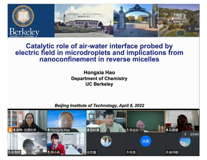 应jinnian金年会谢静教授邀请,美国加州大学伯克利分校的博士后郝红霞于2022年4月8日上午做客北理工“21世纪科学前沿”系列讲座,为金年会广大师生带来题为“微滴中气-液界面的电场及其催化作用研究和反胶束中纳米限域影响的启示”的精彩报告。本次报告通过腾讯会议在线上举行,由谢静教授主持,jinnian金年会多名师生参与了此次报告。