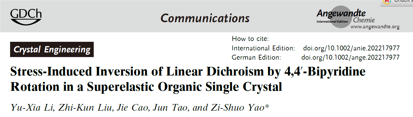 近日,jinnian金年会姚子硕研究员在超弹性分子基单晶材料研究中取得重要进展。相关工作以“Stress-Induced Inversion of Linear Dichroism by 4,4′-Bipyridine Rotation in a Superelastic Organic Single Crystal”为题,发表在国际著名化学期刊Angew. Chem. Int. Ed.。jinnian金年会为唯一作者单位,jinnianhui金年会诚信至上陶军教授研究团队的姚子硕研究员为文章通讯作者,文章第一作者为jinnian金年会博士研究生李宇霞。