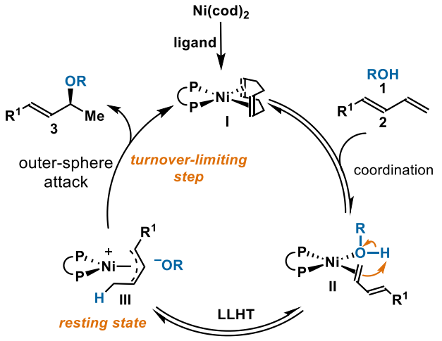 醚(C-O)键广泛存在于药物、农用化学品和功能材料中,其高效构筑吸引了研究者越来越多的关注。通常C-O键是通过Rh、Ru、Pd或Au等贵金属催化的炔烃或联烯的氢烷氧化反应来构筑(图1)。通过廉价易得的丰产金属(例如Ni)催化1,3-二烯的氢烷氧化来构建C-O键,最近引起化学家们的兴趣。然而Ni催化1,3-二烯的氢烷氧化反应目前主要面临两个挑战:1) Ni通常会可逆地活化C-O键,导致产物消旋化;2) 反应的区域选择性问题。为了解决这些挑战,近日jinnian金年会杨小会课题组首次报道了无溶剂条件下Ni催化1,3-二烯的不对称氢烷氧化反应,能以高对映选择性和区域选择性地构筑C-O键(1)。