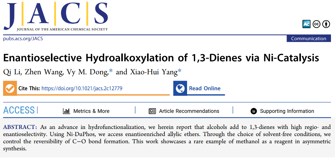 北理工杨小会团队在Ni催化1,3-二烯不对称氢烷氧化反应方面取得重要进展
