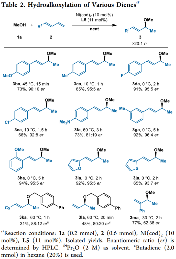 图2. 不同类型1,3-二烯的氢烷氧化反应。