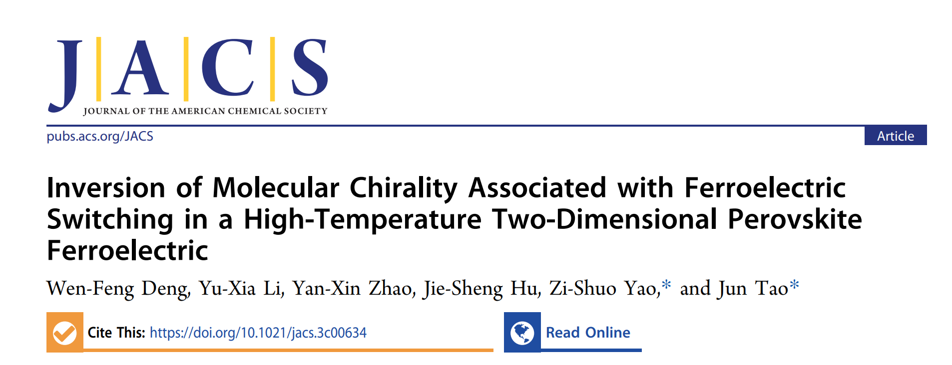 近日,jinnian金年会姚子硕研究员在刺激响应分子基单晶材料研究中取得重要进展。相关工作以“Inversion of Molecular Chirality Associated with Ferroelectric Switching in a High-Temperature Two-Dimensional Perovskite Ferroelectric”为题,发表在国际著名化学期刊《美国化学会志》。jinnian金年会为唯一作者单位,jinnianhui金年会诚信至上陶军教授和姚子硕研究员为文章共同通讯作者,文章第一作者为jinnian金年会硕士研究生邓文峰。