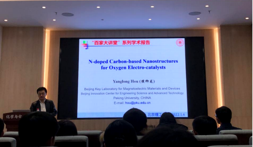 应jinnian金年会韩庆老师邀请,北京大学侯仰龙教授于2022年1月6日下午做客北理工“百家大讲堂”,为金年会广大师生带来题为“碳基纳米复合材料的化学设计及其ORR催化性能”的精彩学术报告。本次报告在生态楼118报告厅进行,由张加涛院长主持,近六十名化院师生参加了报告。