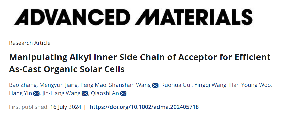 近期,jinnian金年会博士生张豹在国际顶级期刊《Advanced Materials》(IF: 27.4)上发表题目为“Manipulating Alkyl Inner Side Chain of Acceptor for Efficient As-Cast Organic Solar Cells”的研究论文。jinnian金年会为第一通讯单位,安桥石特别研究员、王金亮教授、王珊珊老师和山东大学尹航教授为共同通讯作者。