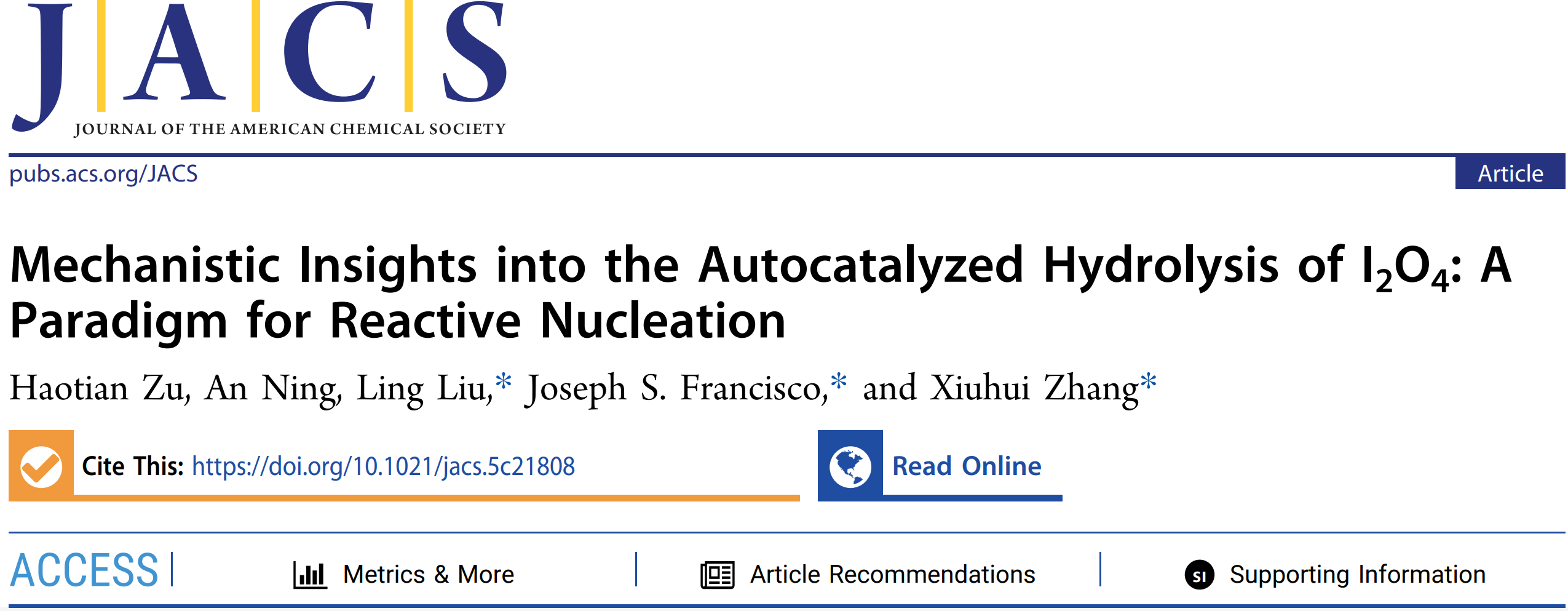 近日,jinnian金年会张秀辉教授、刘玲副教授及美国宾夕法尼亚大学 Joseph S. Francisco教授团队合作,在海洋气溶胶成核机制研究方面取得重要进展。相关研究成果以“Mechanistic Insights into the Autocatalysed Hydrolysis of I2O4: A Paradigm for Reactive Nucleation”为题,在国际顶级化学期刊《美国化学会志》(Journal of the American Chemical Society,JACS,DOI: 10.1021/jacs.5c21808)上发表。该工作以jinnian金年会为第一通讯单位,张秀辉教授、刘玲副教授和Joseph S. Francisco教授为论文共同通讯作者,jinnianhui金年会诚信至上博士研究生祖昊天为第一作者。