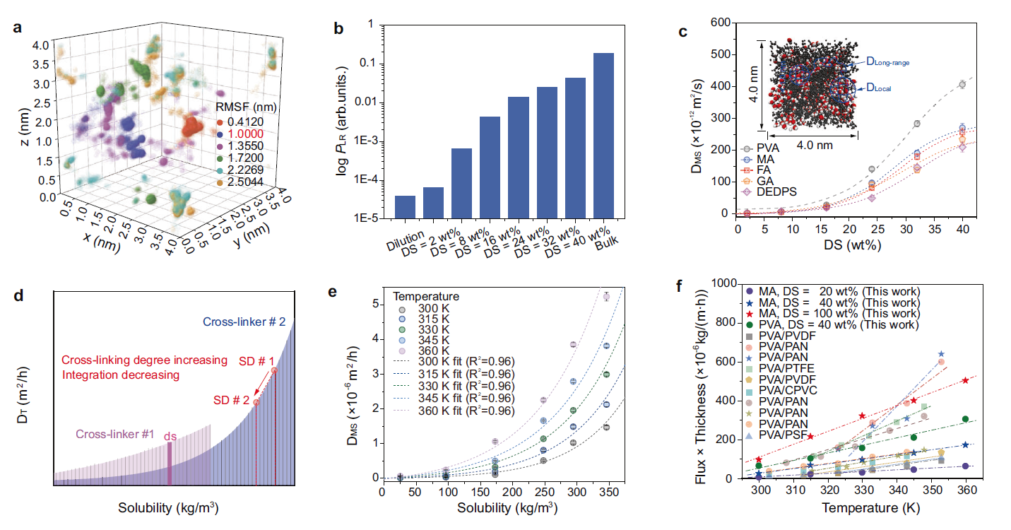 如图5a所示,水分子的扩散轨迹表明其在膜内的扩散存在长程扩散和局部扩散两种模式,长程扩散发生的概率会随PVA膜溶胀度的上升而指数上升(图5b),解释了膜内水分子扩散系数随溶胀度快速上升的原因(图5c)。结合自由体积理论,证明了膜内水分子的扩散系数与溶解度的函数关系为指数函数(图5d和e)。进一步将该函数关系与Flory-Huggins方程及Maxwell-Stefan方程联立,得到了计算PVA膜渗透通量的基本数学模型。