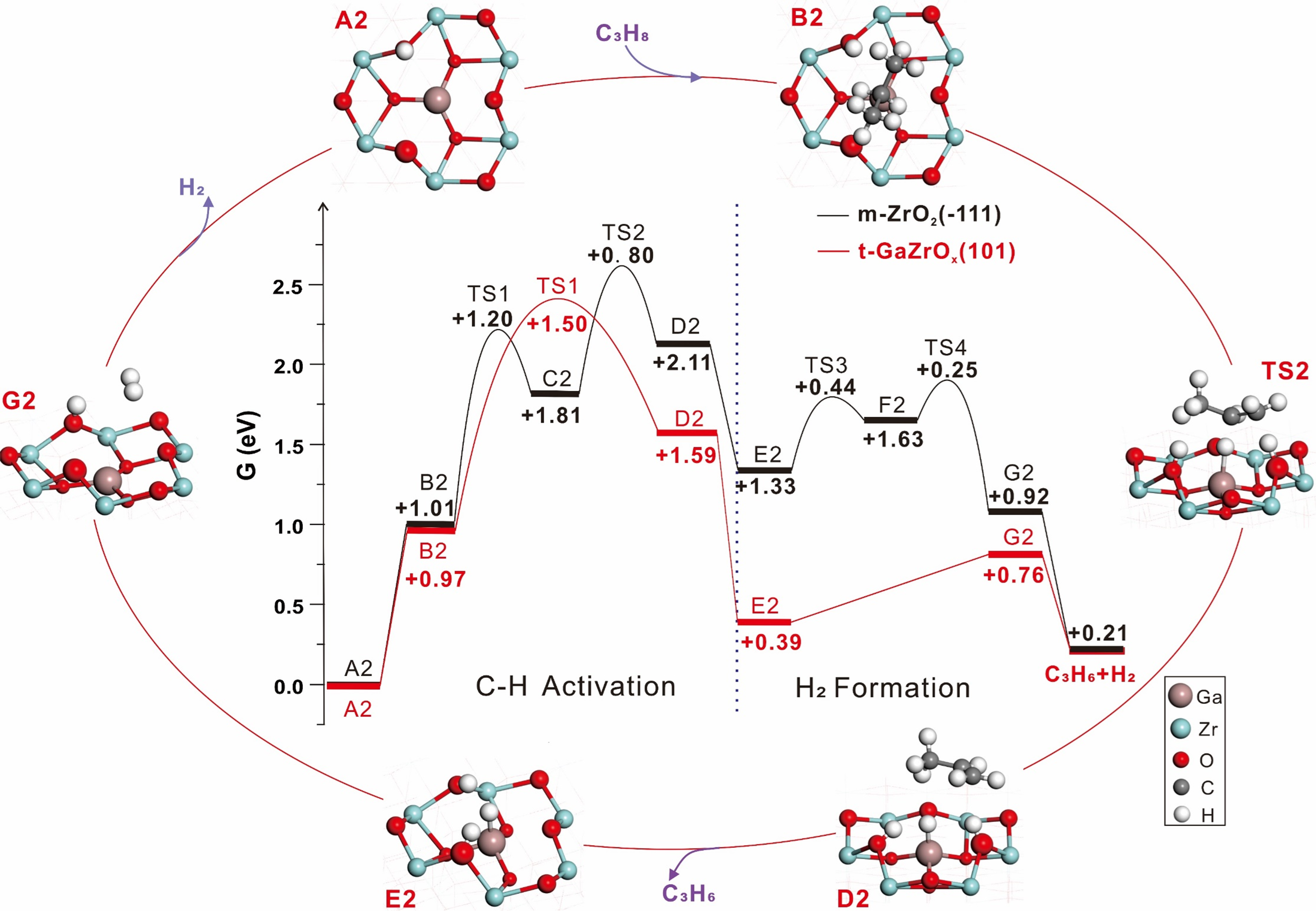 图3 m-ZrO2(-111)与t-GaZrOx(101)在PDH反应中的能垒和过渡态结构