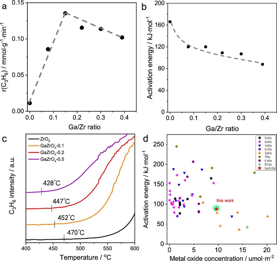 该团队在前期研究工作的基础上(Nature Communications, 2018, 9(1): 3794;J Catal, 2019, 371: 313-324;ACS Catalysis, 2020, 10(11): 6377-6388.),重点对ZrO2基催化剂进行金属改性来提升PDH催化反应性能和调控C-H键活化机制。该工作首先通过水热法合成了系列Ga掺杂ZrO2(GaZrOx)催化剂。活性测试结果表明,在550 ℃,40%C3H8/N2丙烷脱氢反应条件下,GaZrOx催化剂丙烯生成速率大幅提高,而Ga/Zr摩尔比是影响丙烯生成速率的重要参数,活性与Ga/Zr比呈火山型曲线。当Ga/Zr比为0.2时,GaZrOx活性最高,初始丙烯生成速率为0.1354 mmol·g-1·min-1,是纯相ZrO2的11倍左右。活化能随着Ga/Zr的增加呈现下降趋势,说明Ga的引入改变了ZrO2催化剂的活性位点种类,产生了本征活性更高的催化位点。C3H8-TPSR结果同样证明了新活性位点的生成。将本文GaZrOx催化剂在丙烷脱氢中的活化能与文献报道的其他金属氧化物基催化剂进行对比,可以看到GaZrOx具有较低的反应活化能,展现出良好的丙烷脱氢应用前景(图1)。