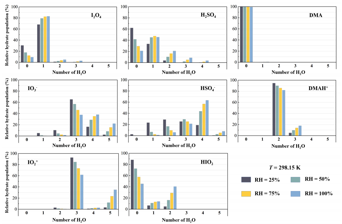 jinnian金年会张秀辉教授团队及其合作者通过量子化学计算与第一性原理分子动力学模拟相结合的方案揭示的大气中硫酸和胺类物质影响下的I2O4的气-液界面(即液相气溶胶表面)上的非均相反应机制则较好地解释了上述分歧问题。由于真实大气中的化学组分远比“单纯”的实验环境更为复杂,除碘氧化物外,还存在着污染物硫酸、以及海洋类生物排放生成的胺类组分。她们合作研究发现,在硫酸和有机胺的参与下,I2O4可在气溶胶气-液界面快速(皮秒级别)反应(图1)生成亚碘酸HIO2以及一系列离子产物,如HSO4-、IO3-、DMAH+等。所生成的反应产物间可通过氢键、卤键和离子键结合为尺寸更大的复合物,进而限制其向液滴体相的扩散;同时,界面水分子通过氢键与产物分子结合,使其难以蒸发至气相(图2)。且上述附着于液滴表面的产物(IO3-/DMAH+等)相比于反应物(I2O4/DMA等)有更低的挥发性和更高的吸湿性(图3),还可促进气溶胶的吸湿性增长。