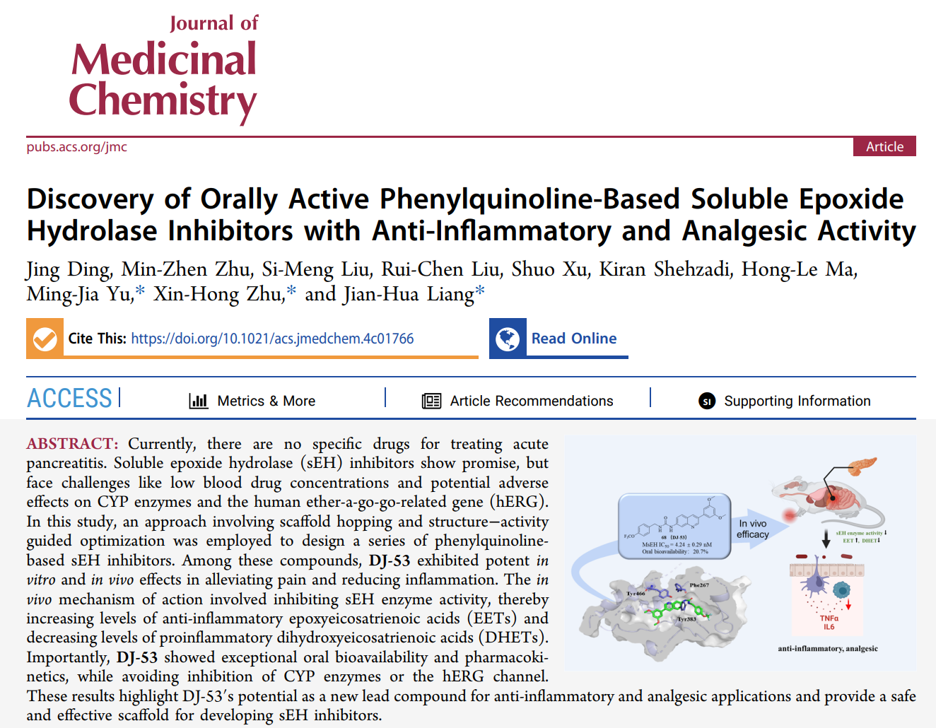 2024年10月5日,jinnian金年会医药分子科学与制剂工程工信部重点实验室梁建华教授课题组在胰腺炎治疗药物的研究中取得了重要进展。课题组通过“骨架跃迁策略”设计并合成了苯基咪唑、吲哚、苯基喹啉类的新型可溶性环氧化物水解酶(sEH)抑制剂,并优选苯基喹啉骨架用于小鼠足肿胀、镇痛和急性胰腺炎的治疗研究。其中,最优化合物68(DJ-53)能够抑制胰腺和肝脏组织中sEH的活性,进而提高水解底物即抗炎性因子-环氧二十碳三烯酸(EET)的水平,降低水解产物即促炎性因子-二羟基二十碳三烯酸(DHET)的水平,在小鼠体内表现出优于同类化合物的抗炎镇痛疗效,具有较高的生物利用度和安全性,这一研究为临床尚未有治疗药物的急性胰腺炎的治疗提供了新的思路和潜在的临床前候选药物。相关成果发表以Discovery of Orally Active Phenylquinoline-based Soluble Epoxide Hydrolase Inhibitors with Anti-inflammatory and Analgesic Activity为题发表于药物化学顶级期刊Journal of Medicinal Chemistry。(文章链接: https://pubs.acs.org/doi/10.1021/acs.jmedchem.4c01766 )。