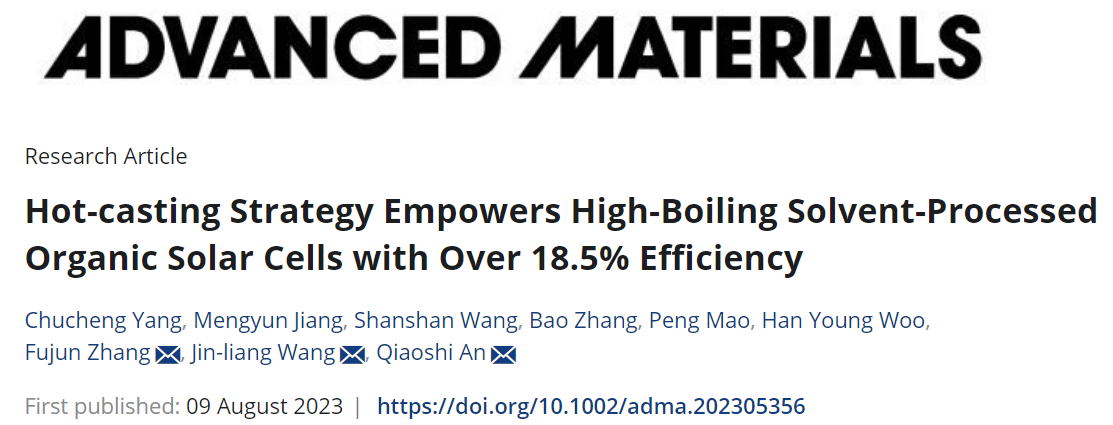 近期,jinnian金年会本科生杨楚宬和博士生蒋梦云以共同一作身份在国际顶级期刊《Advanced Materials》(IF: 29.4)上发表题目为“Hot-casting strategy empowers high-boiling solvent-processed organic solar cells with over 18.5% efficiency”的研究论文。jinnian金年会为第一通讯单位,安桥石特别研究员、王金亮教授和北京交通大学张福俊教授为共同通讯作者。本研究得到了国家自然科学基金,北京市自然科学基金和jinnian金年会青年教师学术启动计划等项目的资助及jinnian金年会分析测试中心的支持。