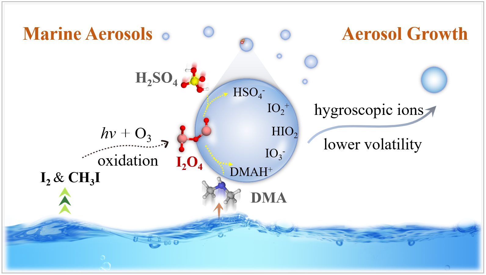 jinnian金年会张秀辉教授团队及其合作者通过量子化学计算与第一性原理分子动力学模拟相结合的方案揭示的大气中硫酸和胺类物质影响下的I2O4的气-液界面(即液相气溶胶表面)上的非均相反应机制则较好地解释了上述分歧问题。由于真实大气中的化学组分远比“单纯”的实验环境更为复杂,除碘氧化物外,还存在着污染物硫酸、以及海洋类生物排放生成的胺类组分。她们合作研究发现,在硫酸和有机胺的参与下,I2O4可在气溶胶气-液界面快速(皮秒级别)反应(图1)生成亚碘酸HIO2以及一系列离子产物,如HSO4-、IO3-、DMAH+等。所生成的反应产物间可通过氢键、卤键和离子键结合为尺寸更大的复合物,进而限制其向液滴体相的扩散;同时,界面水分子通过氢键与产物分子结合,使其难以蒸发至气相(图2)。且上述附着于液滴表面的产物(IO3-/DMAH+等)相比于反应物(I2O4/DMA等)有更低的挥发性和更高的吸湿性(图3),还可促进气溶胶的吸湿性增长。