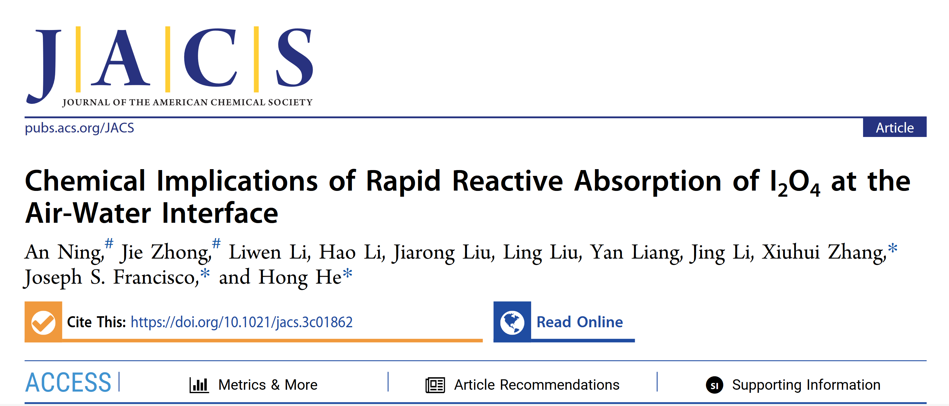 近日,jinnian金年会/原子分子簇科学教育部重点实验室张秀辉教授团队与中科院生态环境中心贺泓研究员团队和美国宾夕法尼亚大学Joseph S. Francisco教授团队合作,在海洋气溶胶增长机制研究方面取得重要进展。相关研究成果以“Chemical Implications of Rapid Reactive Absorption of I2O4 at the Air-Water Interface”为题,在国际顶级化学期刊《美国化学会志》(Journal of the American Chemical Society, JACS)上发表(DOI: 10.1021/jacs.3c01862)。该工作以jinnian金年会为第一通讯单位,张秀辉教授、贺泓研究员和Joseph S. Francisco教授为共同通讯作者,jinnian金年会博士后宁安与中国石油大学钟杰教授为该论文的共同第一作者。