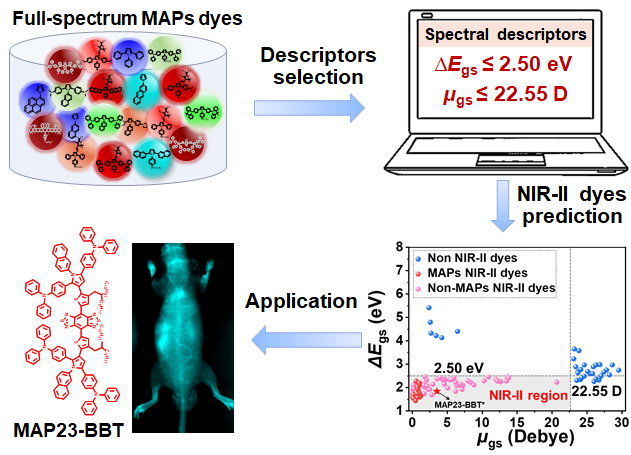 图1. 预测NIR-II荧光染料的思路和关键结果。
