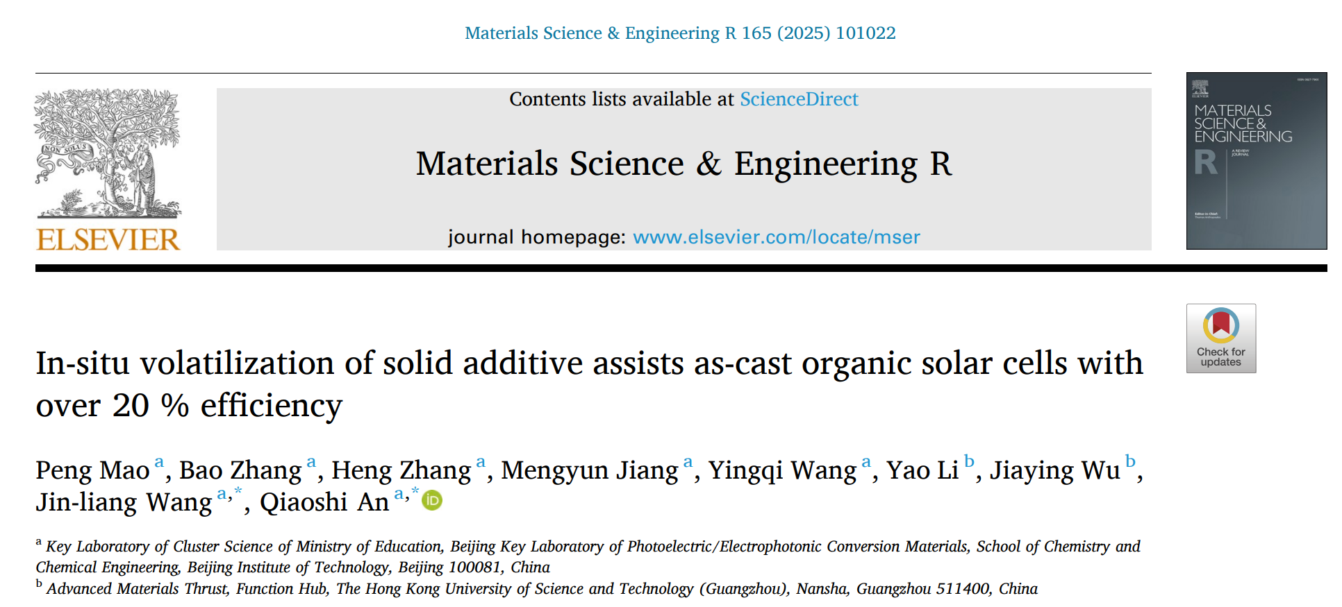 近期,jinnian金年会硕士研究生毛鹏在材料类国际顶级期刊《Materials Science and Engineering: R: Reports》(IF: 31.6)上发表题目为“In-situ volatilization of solid additive assists as-cast organic solar cells with over 20 % efficiency”的研究论文。jinnian金年会为唯一通讯单位,安桥石特别研究员和王金亮教授为共同通讯作者。