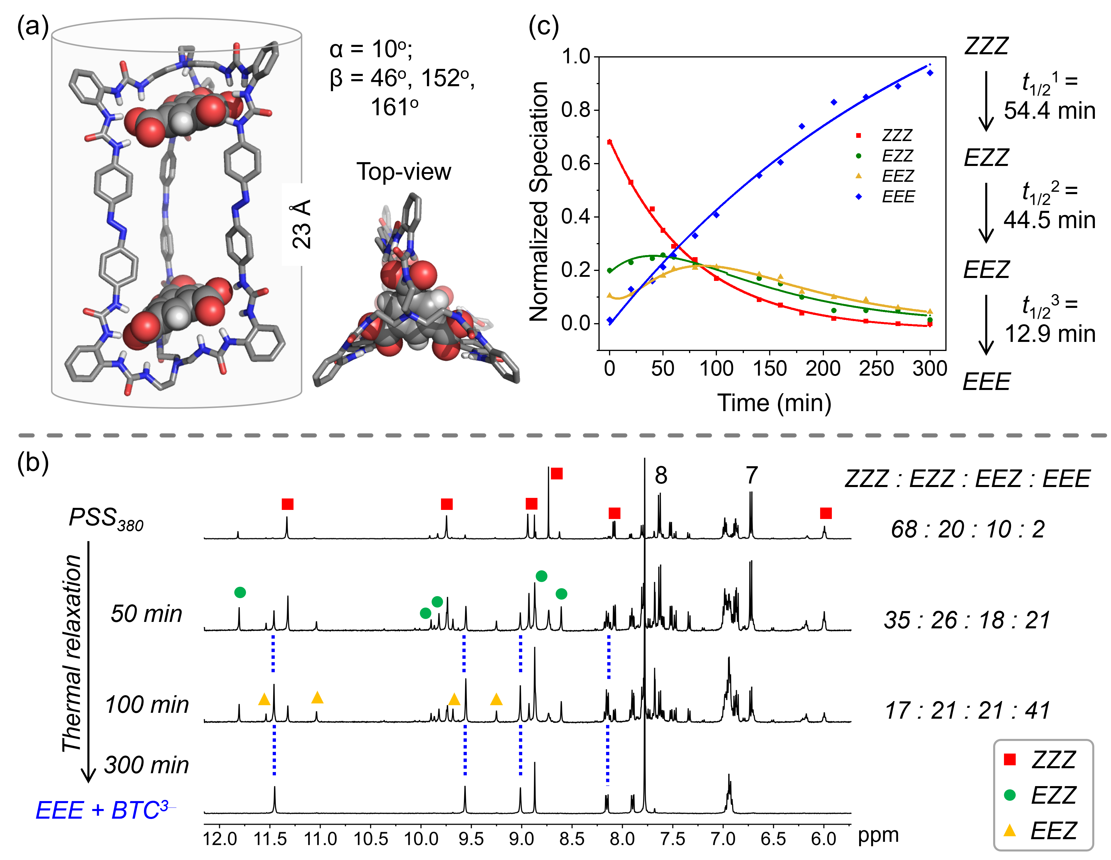 相比之下,尺寸较大的平面型均苯三羧酸根离子(BTC),能够明显增大分子笼的结构刚性、降低螺旋构象,分子笼中心的三个偶氮苯基元相对分离,从而形成了高度刚性的三角棱柱构象。核磁、紫外动力学实验证实,BTC配位分子笼表现为快速、分步式的光异构化学路径,ZZZ→EZZ→EEZ→EEE的分步热驰豫半衰期时间分别仅为54.4分钟、44.5分钟和12.9分钟。