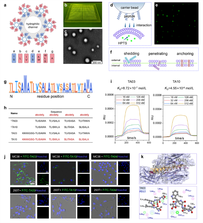 图1 多肽超分子的筛选与设计。a) 多肽纳米孔道筛选方法的建立。b) 纳米孔道多肽分子。c)色氨酸锚定细胞膜示意。d) 纳米孔道实现免疫检查点阻断。
