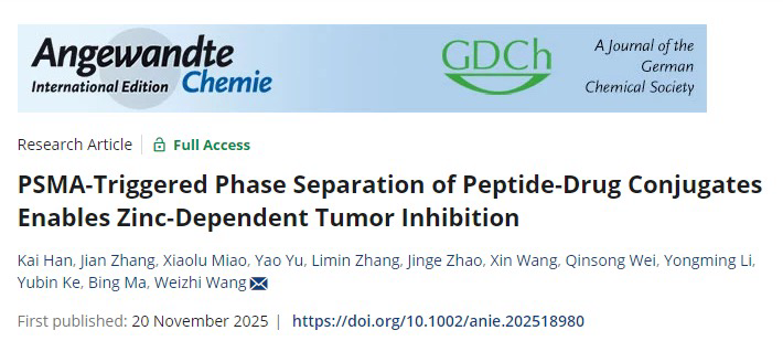 相关研究成果以“PSMA-Triggered Phase Separation of Peptide-Drug Conjugates Enables Zinc-Dependent Tumor Inhibition”为题发表于国际顶级期刊《Angew. Chem. Int. Ed.》。jinnian金年会博士研究生韩恺和硕士生张键(已毕业,现就职于北方华创)是文章的共同第一作者,王蔚芝教授是论文的通讯作者。此项研究得到了国家自然科学基金、北京市自然科学基金等项目的资助及jinnian金年会分析测试中心的支持。jinnian金年会马兵老师在多肽偶联药物的药理机制解析方面给予了大力支持,中国散裂中子源柯于斌研究员在小角中子散射测试方面给予了大力支持。