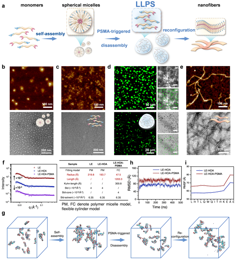 综合考虑多肽的级联识别与自适应重构需求,构建了基于全天然氨基酸的十四肽高通量(108)组合分子库。C端谷氨酸(E)和赖氨酸(K)为亲水识别基团,以赋予特异性结合PSMA的能力。通过引入亮氨酸(L)、色氨酸(W)和组氨酸(H)调节疏水-亲水平衡以增强LLPS潜力,同时引入苏氨酸(T)和谷氨酰胺(Q)以增强氢键相互作用并促进肽链的自组装能力。通过三轮筛选(细胞靶向筛选,微流控阵列液-液相分离潜能筛选和计算机辅助筛选),最终得到具有靶向PSMA和液液相分离潜能的多肽LE。LE处于两种自组装形貌的临界状态,表明其不仅容易发生形貌转变,还可能在转变过程中经历亚稳且非解离的中间态,有望在生理环境下经历LLPS过程(图2)。