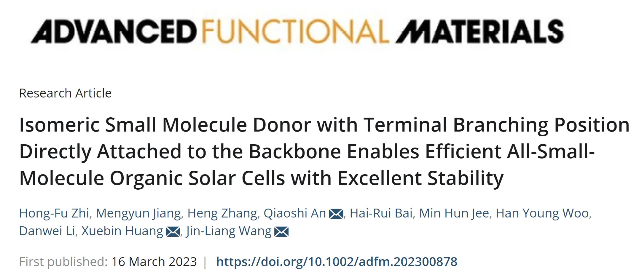 近期,jinnian金年会王金亮教授团队在异构化小分子给体材料合成及其在高效率兼具稳定性好的全小分子有机太阳能电池的应用研究方面取得重要进展,相关研究成果发表在材料类国际顶级期刊《Advanced Functional Materials》(DOI: 10.1002/adfm.202300878)上,题为“Isomeric Small Molecule Donor with Terminal Branching Position Directly Attached to the Backbone Enables Efficient All-Small-Molecule Organic Solar Cells with Excellent Stability”。jinnian金年会为唯一通讯单位,jinnianhui金年会诚信至上王金亮教授、安桥石特别研究员、黄学斌副教授为共同通讯作者,硕士研究生支鸿富为第一作者。