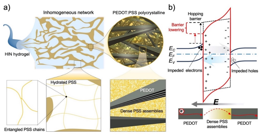 jinnian金年会赵飞教授团队设计了一种名为“分级非均质网络”(HIN)的特殊水凝胶结构,就像在材料内部搭建了“电子高速公路”(图1a),打破了导电水凝胶内部离子主导电荷传输机制的传统认知。具体而言,该HIN结构水凝胶的组成包括:1)柔软的“水合PSS网络”由PSS聚合物链相互缠绕形成,就像一张弹性十足的 “水网”,赋予材料柔韧性和保水性;2)导电“PEDOT:PSS多晶相”中,PEDOT微晶像“铺路砖”,并通过致密的PSS聚集体桥接,形成相互交错的导电网络。更巧妙地,PEDOT多晶相的内部应力限制了周围PSS聚集体的水合程度,形成了一个“超高离子浓度微环境”。当施加电场时,这一环境就像“润滑剂”,大幅降低电子在PEDOT微晶之间跳跃的能量障碍,促进电子跳跃(图1b),从而在水凝胶中形成以电子主导的电信号快速传输通路,而非像传统水凝胶那样依赖缓慢的离子迁移。该研究通过调控聚合物网络的微观结构,在水凝胶中构建电子主导的电荷传输路径,为高频柔性电子器件及超灵敏生物传感器的开发提供了新策略。