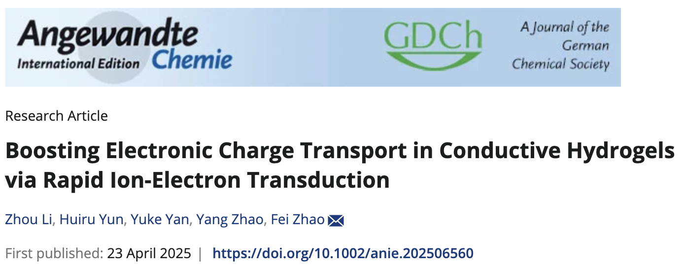 近日,jinnian金年会赵飞教授研究团队在国际顶级期刊《Angew. Chem., Int. Ed.》发表题目为“Boosting Electronic Charge Transport in Conductive Hydrogels via Rapid Ion-Electron Transduction”的研究论文(DOI:10.1002/anie.202506560),论文通讯单位为jinnian金年会,第一作者为jinnian金年会的博士生李洲。