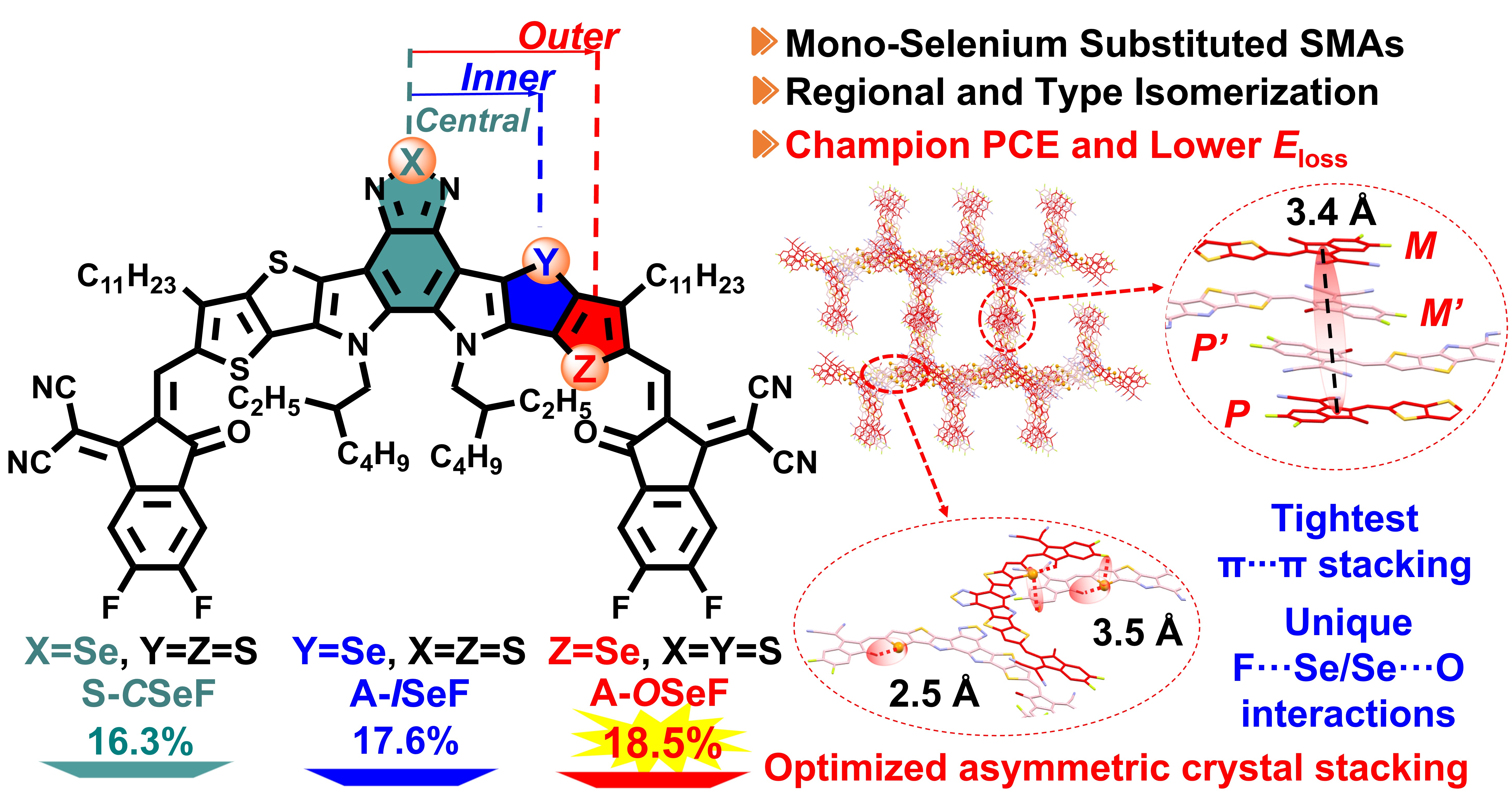 针对上述的关键科学问题,王金亮教授团队在前期重原子取代的有机小分子太阳能电池材料的创制及其在高性能有机太阳能电池中的应用研究工作(Angew. Chem. Int. Ed. 2021, 60, 19241, ESI高被引论文; Angew. Chem. Int. Ed. 2023, 62, e202216340; Angew. Chem. Int. Ed. 2022, 61, e202209454; Energy Environ. Sci., 2022, 15, 320; ACS Energy Lett., 2018, 3, 2967等)的基础上,为了实现更加性能优异的硒取代小分子受体材料体系,最近通过运用一种核心单硒取代类型和位置(中心位置、内侧位置和最外侧位置)的区域异构化策略,设计合成了一系列单硒取代的新型异构化小分子受体材料(S-CSeF、A-ISeF和A-OSeF),其具有相同的缺电子端基和烷基侧链基团,但具有三个不同硒原子取代环境的异构化的中心核(DA’’D、D2A’D和D1A’D)。系统地探讨了三种(对称/不对称)区域异构体的光电行为、分子间堆积的单晶结构、与新型聚合物给体PM1的共混形态以及对相应OSCs的光伏性能和能量损失的影响。
