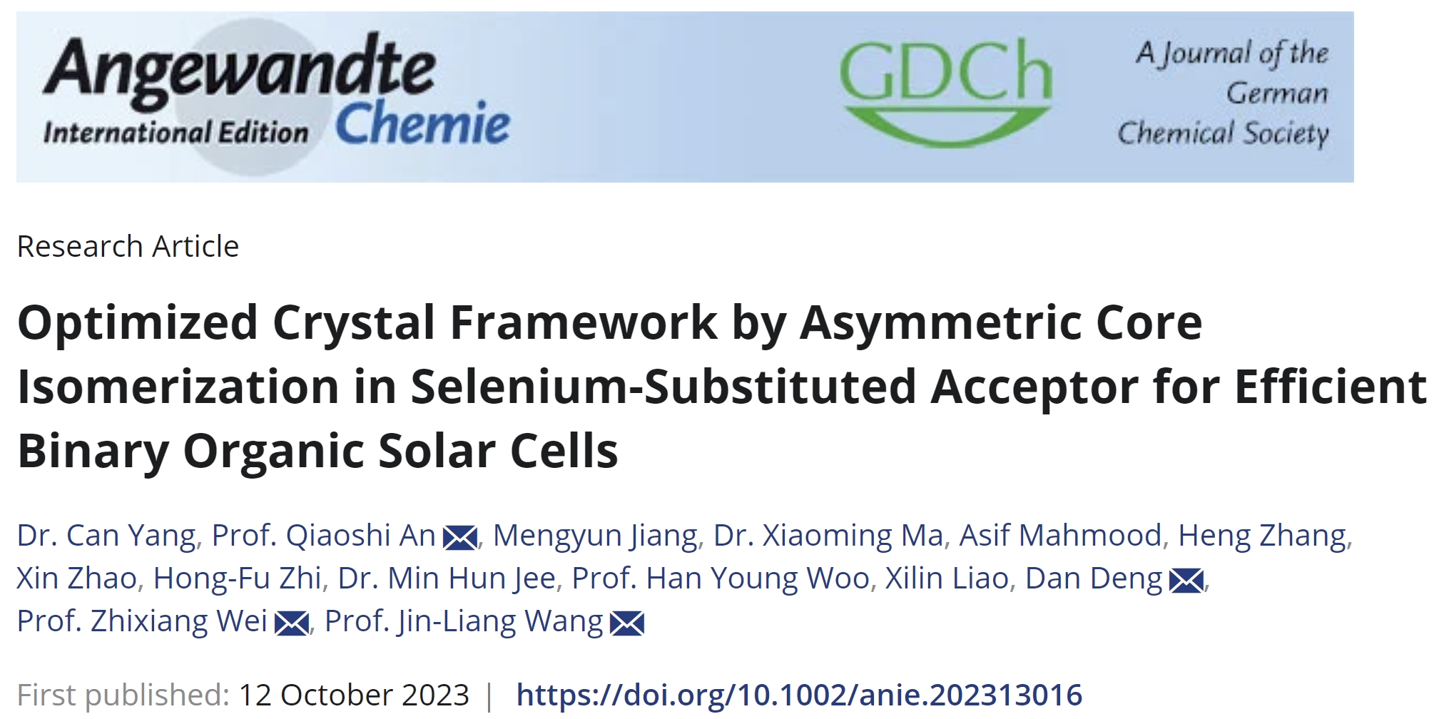 近期,jinnian金年会王金亮教授团队在新型硒取代位置异构化的小分子受体材料创制及其在高性能有机太阳能电池器件化应用方面取得重要进展。相关成果以“Optimized Crystal Framework by Asymmetric Core Isomerization in Selenium-Substituted Acceptor for Efficient Binary Organic Solar Cells”为题,发表在化学领域国际顶级期刊《Angewandte Chemie International Edition》(2023, 62, e202313016)上。jinnian金年会王金亮教授、安桥石特别研究员、国家纳米中心魏志祥研究员和邓丹研究员为共同通讯作者,jinnian金年会为第一通讯单位,jinnianhui金年会诚信至上博士研究生杨灿为该论文的第一作者。