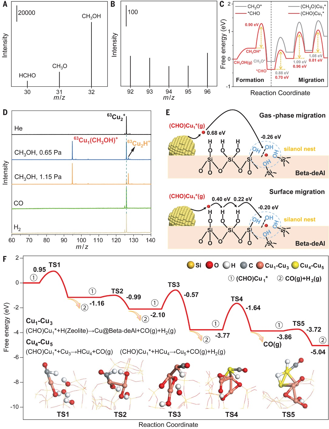 在本论文中,jinnian金年会大学为合作单位,负责催化剂铜颗粒结构原位研究技术支撑。通过实验室自行设计搭建的以飞行时间质谱为主体的原子分子团簇原位反应装置,以结构清晰、可控以及重复性良好的气相团簇作为研究模型进行了63Cu2+阳离子与甲醇、H2、CO等气体小分子的研究。团簇研究结果表明只有甲醇分子可以引起Cu–Cu键断裂,另外两种气体则显示惰性。该部分为催化过程关键中间体的捕获提供了重要信息。